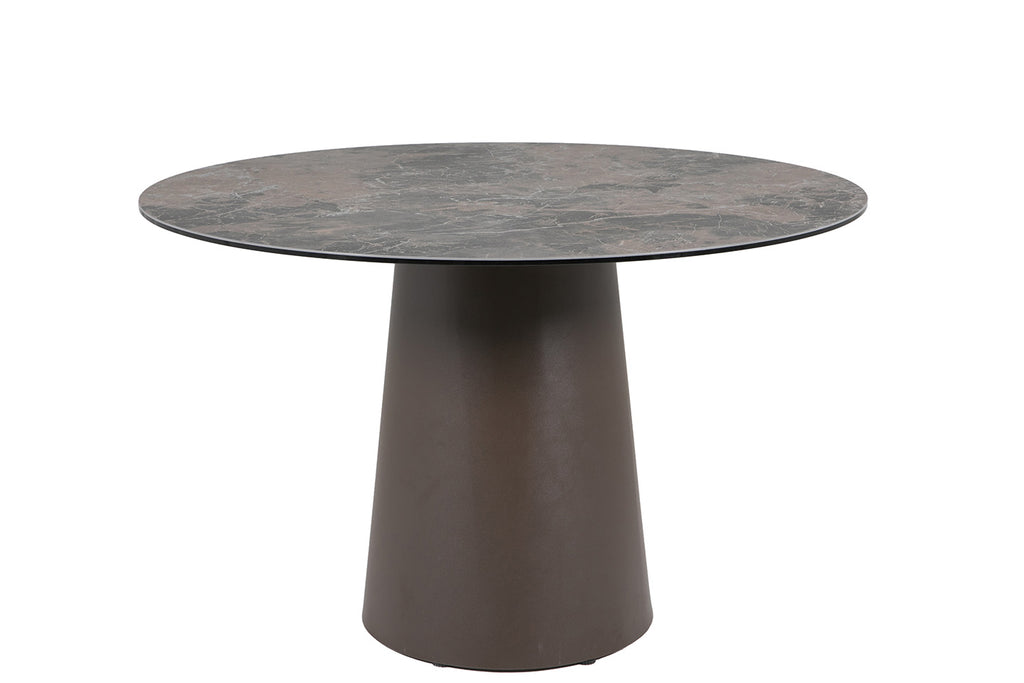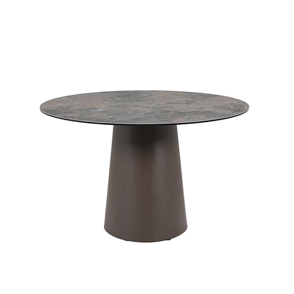 Atom features black sintered stone with golden metal or Italian ceramic with brown-coated metal pedestal bases whose simplicity belie how striking they look in a modern dining setting.