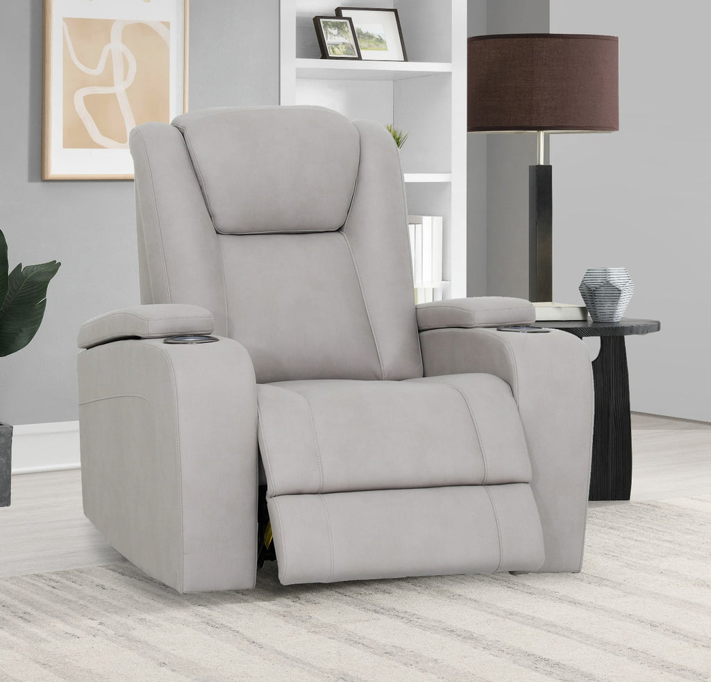 Ultra-modern suite which includes 3-seater, 2-seater w/con, and armchair, featuring integrated cupholders on armrests. Perfect for any living space, combining contemporary elegance with ultimate convenience and comfort.